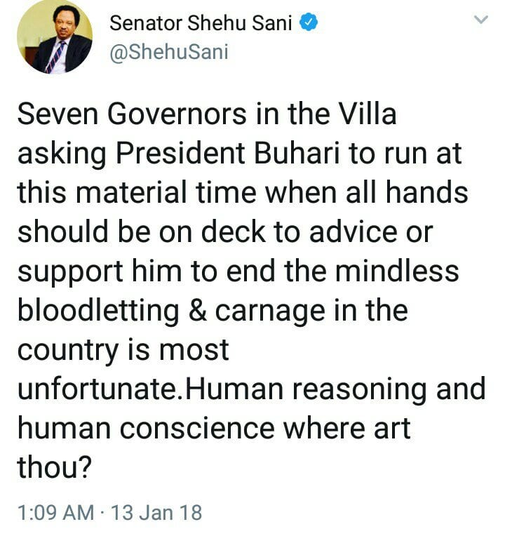 The Senator representing Kaduna Central in the National Assembly, Shehu Sani, has described as “Unfortunate” the Friday’s visit of seven governors of Northern extraction to Aso Rock. Reacting through his Twitter handle, the Senator said that visiting Aso Rock to ask the president to run for a second term at a time when the country is in turmoil is most unfortunate. The Senator said that they should have instead advised the president to put an end to the mindless bloodletting, describing the governors as lacking in human reasoning. This is coming a day after about 75 persons massacred by herdsmen in Guma Local Government Area of Benue on New Year day were laid to rest. Seven state governor had on Friday, visited the president to ask him to run for a second term in office. Speaking to the Press after the visit, the Kaduna State Governor, Mallam Nasir El-Rufai, said that he had no regrets for the visit, describing it as a necessity. Other governors who were present during the visit include the Kano State Governor, Abdullahi Ganduje, Jibrila Bindo (Adamawa), Simon Lalong (Plateau), Abubakar Bello (Niger), Yahaya Bello (Kogi), Ibrahim Gaidam (Yobe). According to the Senator: “Seven Governors in the Villa asking President Buhari to run at this material time when all hands should be on deck to advice or support him to end the mindless bloodletting & carnage in the country is most unfortunate. Human reasoning and human conscience where art thou?”