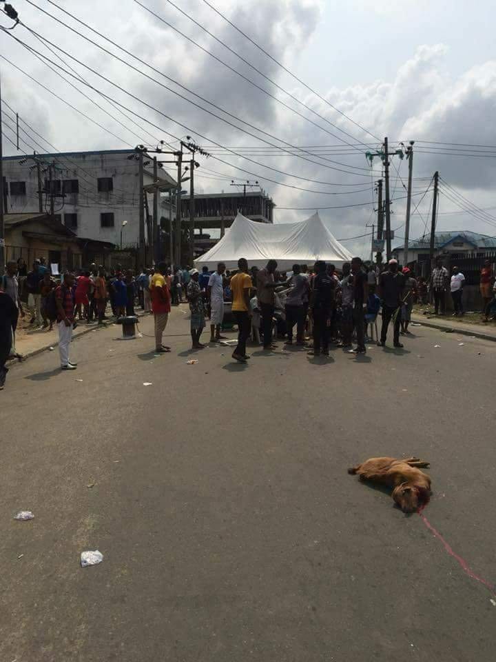 TPCN correspondent reports that the Ogbunabali community’s women brought out their cooking items and were seen cooking on the streets while a slaughtered goat was decorated with PHED “Costumes “.