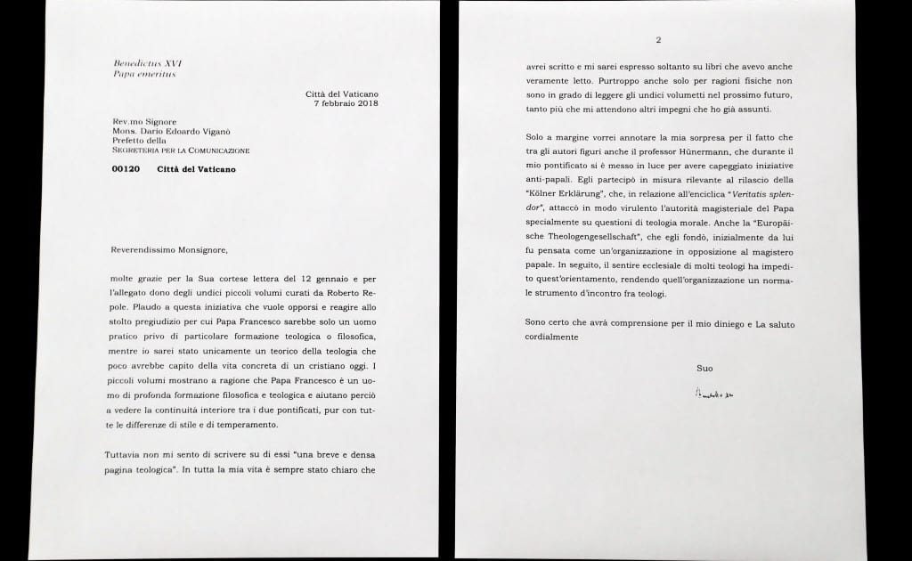 The previously hidden part of the letter provides the full explanation why Benedict refused to write a commentary on a new Vatican-published compilation of books about Francis’ theological and philosophical background that was released to mark his fifth anniversary as pope.