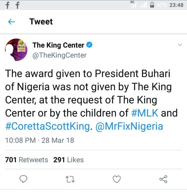 The party said the nation was jolted when the King Center distanced itself from the award and noted that, “the award given to President Buhari of Nigeria was not given by The King Center, at the request of The King Center or by the children of Martin Luther King jr”.