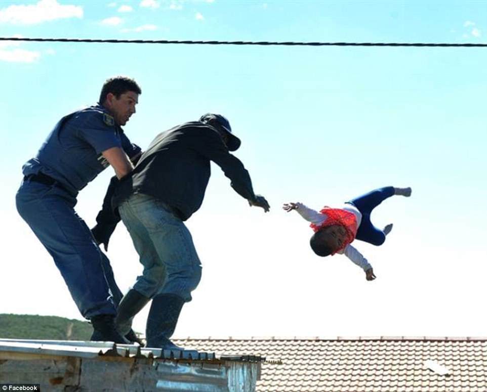 Horror: The shock on the police officer’s face and the fear of the screaming baby is all too clear in the photo of the moment she is thrown off the roof
