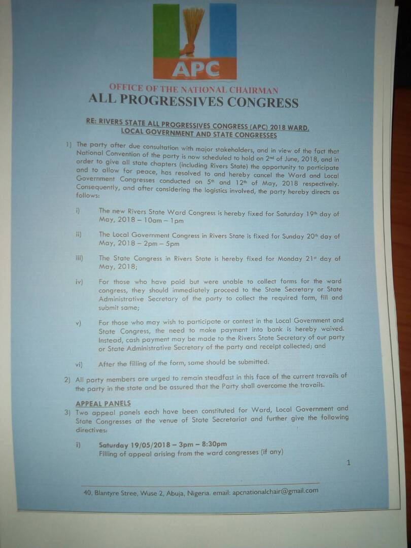 The party said it reached this decision after due consultation with major stakeholders and in view of the fact that the National Convention of the party is scheduled for 2nd June 2018, and in order to allow all state chapters to participate including Rivers, and also in the interest of peace.