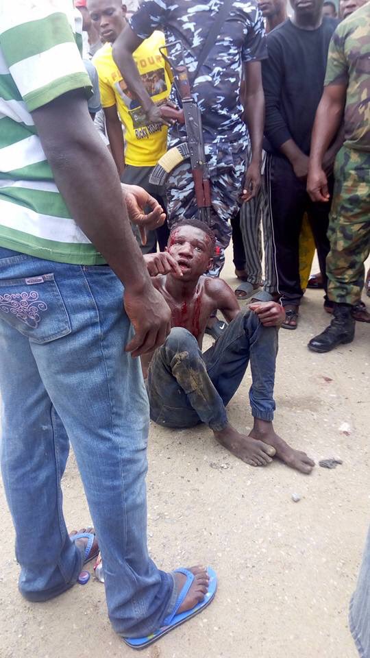 Pictures captured at the scene showed a police officer carrying a riffle and a Nigerian Army personnel with people suspected to be members of the community, standing at the scene before the bloodied robbery suspect was eventually set ablaze.