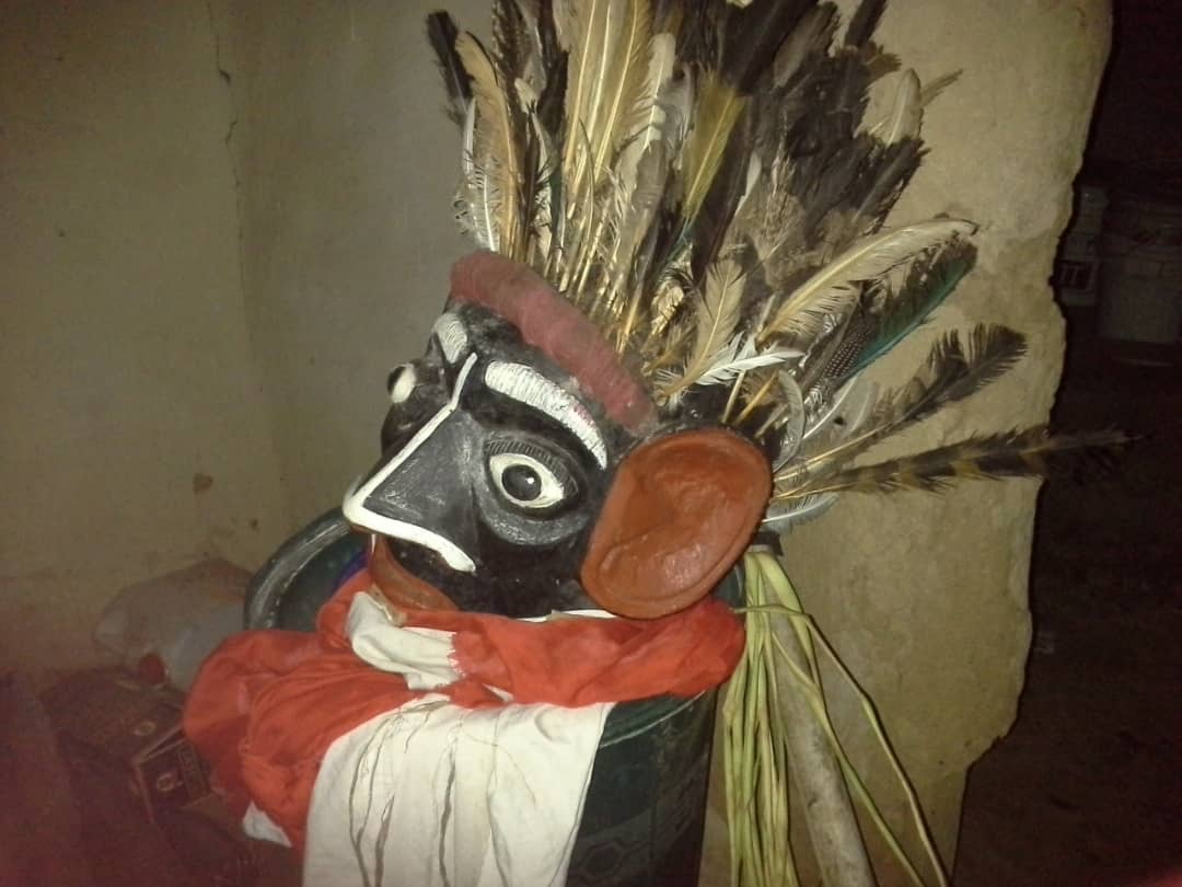 Ogbumadubé is so dangerous it has a thick restraining chain tied around its waist. This chain is held by two attendants and occasionally pulled to restrain Ogbumadubè from harming people when the dancer is overtaken by the potency of its permeating essence. The mask itself was no joke. Two huge ears stick out from both sides of a big head crowned with feathers of different colours and type; a giant nose, a big mouth and two large, but blind eyes complete the visage.