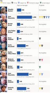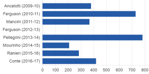 Since 2009-10, Carlo Ancelotti, Roberto Mancini, Jose Mourinho, Claudio Ranieri and Conte have all been sacked – with Alex Ferguson retiring – within about a year of winning the title.
