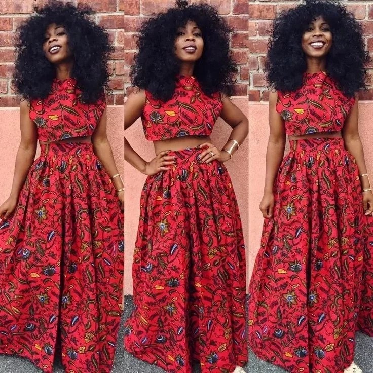 Combinations of an Ankara skirt with a blouse of a solid color and vice versa have become very popular when women had understood their attractiveness and practical side. Wearing different skirts with the same top can provide you with a fresh outfit each time you create a new combination.