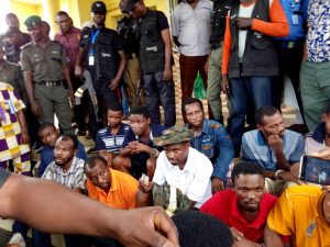Also paraded were a six-man gang of suspected kidnappers operating in an unregistered police colour ford ranger van and police accoutrements.
