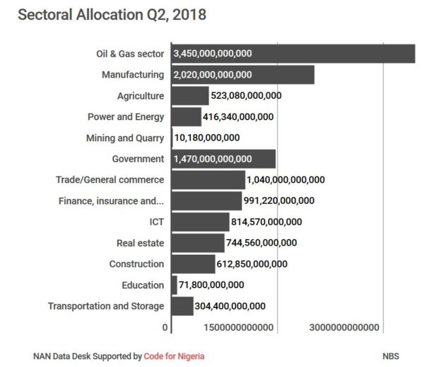 N3.42 trillion in Q1 2018, while finance to the Manufacturing sector dropped to N2.02 trillion from N2.07 trillion in Q1.