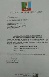 A copy of the letter which was sent to theportcitynews by Chris Finebone, the publicity secretary of the party indicates that the National Chairman of the All Progressives Congress, APC, Adams Oshiomhole, has invited Ojukaye Flag Amachree, to the APC National Executive committee (NEC) meeting scheduled for August 30, 2018, at the APC National Secretariat in Abuja .