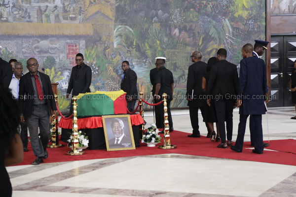 His coffin, draped in Ghana’s red, green and gold flag, was guarded by senior military officers in ceremonial uniform at the Accra International Conference Centre.