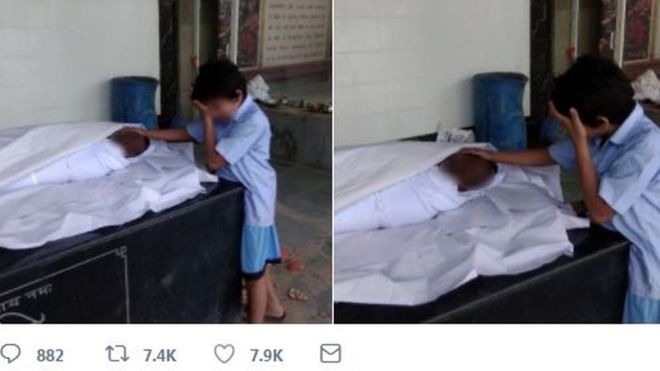 Shiv Sunny, a reporter at The Hindustan Times, who tweeted the picture on Monday, told the BBC that he was “shaken” by the sight of the man’s grieving son, who is 11.