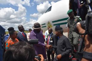 Vice-President, Yemi Osibanjo, on Friday, arrived the Port Harcourt int’l airport to access the commiserate with the state over the ravaging flood that had rendered many homeless in Ahoada-West.