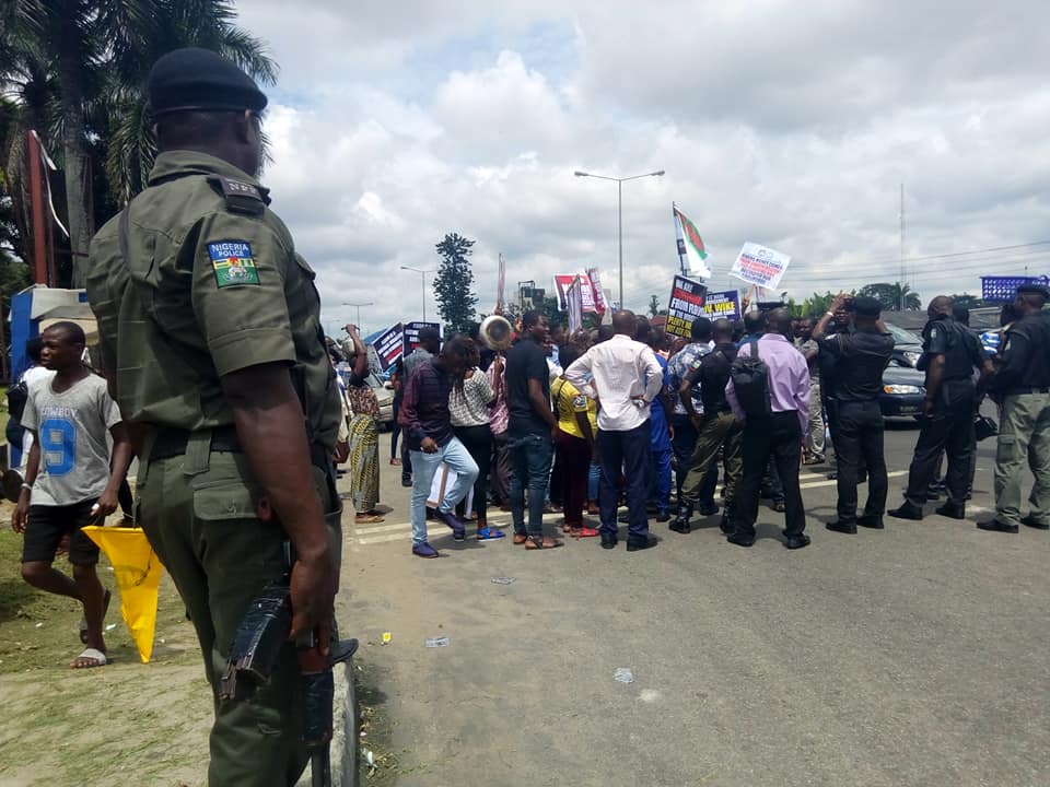 Men of the Nigerian police today barred a group of peaceful protesters from proceeding to the Rivers State government house to see the state governor, E. N. Wike.
