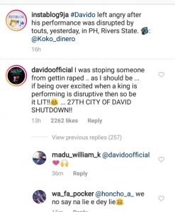 But reacting in a comment on a post by Instablog9ja, Davido said the concert was disrupted because he was stopping someones from getting raped.