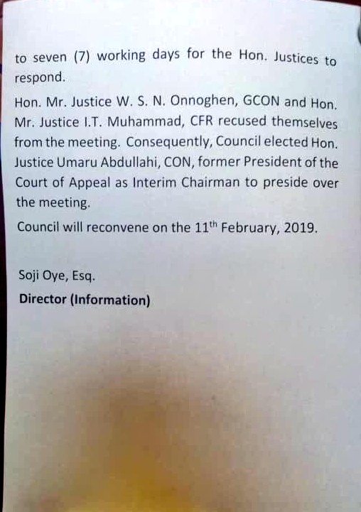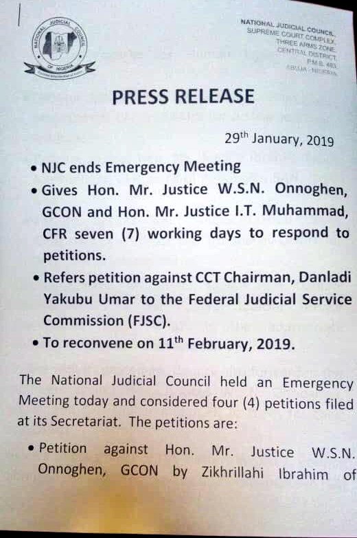 The National Judicial Council (NJC) has issued seven working days as ultimatum to Justice Walter Onnoghen and Justice Ibrahim Tanko Muhammad to respond to petitions written against them.