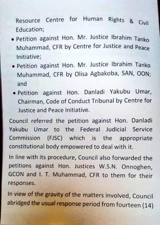 The NJC also referred the petition written against Danladi Umar, the CCT Chairman, to the Federal Judicial Service Commission.