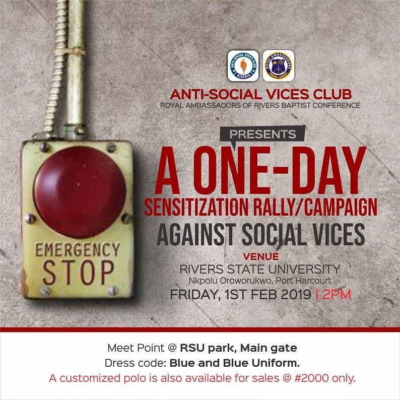An advocacy group known as Anti Social Vices Club has taken campaign to the Rivers State University, Port Harcourt.