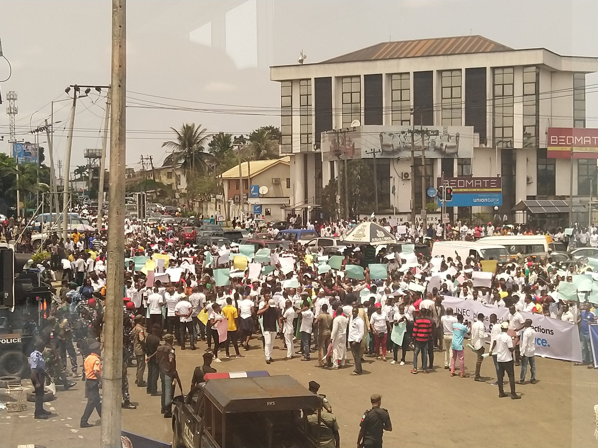 Protesters are marching to the Rivers State headquarters of the Independent National Electoral Commission, INEC, demanding the declaration of the Saturday, March 9 Gubernatorial and State House of Assembly elections.