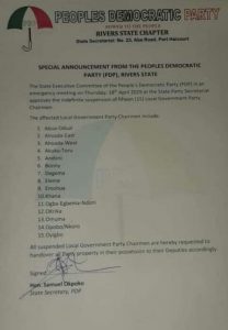 The Peoples Democratic Party, PDP, in Rivers State has announced the suspension of fifteen local government areas chairmen.