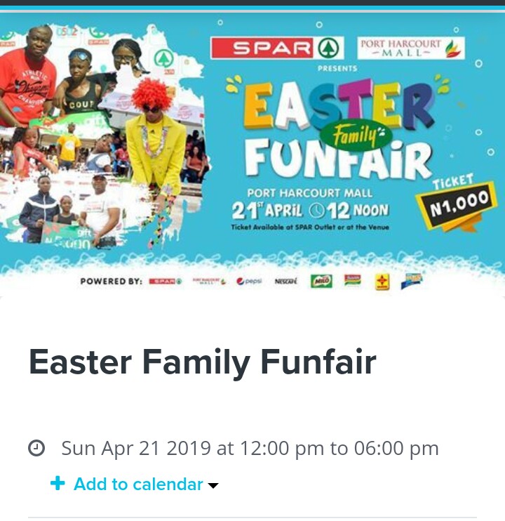 Looking for where the whole family can have fun this holiday? The Easter family fun fair features lots of games and gifts to be won. The event will take place on Sunday, 21stof April at Spar Nigeria, Azikiwe Road Port Harcourt by 12noon. A thousand naira admits a child.