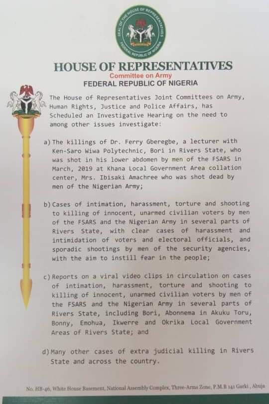 The House of Representatives will also investigate reports on a viral video clips in circulation on cases of intimation, harassment, torture and shooting to killing of unarmed civilian voters by men of SARS and the Nigerian Army in several parts of Rivers State, including Bori, Abonnema in Akuku Toru, Bonny, Emohua , Ikwerre and Okrika Local Government Areas of Rivers State; and many other cases of extra Judicial killing in the state.