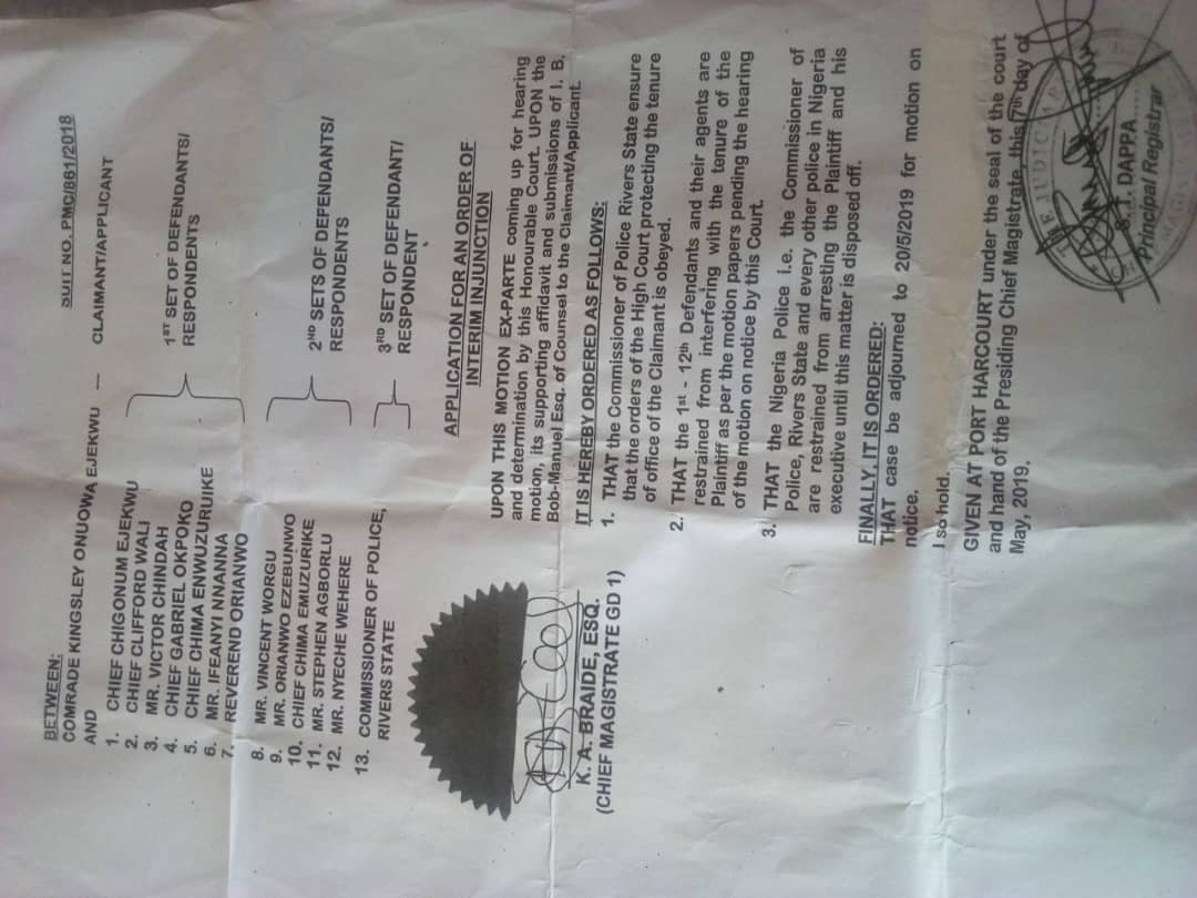The statement reads in parts, “that the action of the state commissioner of police through his monitoring team in the arrest and detention of the Rumuokwurusi Town Council Chairman, Ejekwu on May 8, 2019 and released same day via administrative bail is illegal and unlawful.