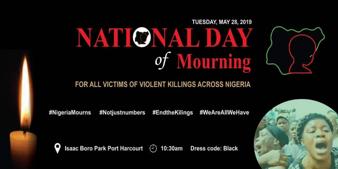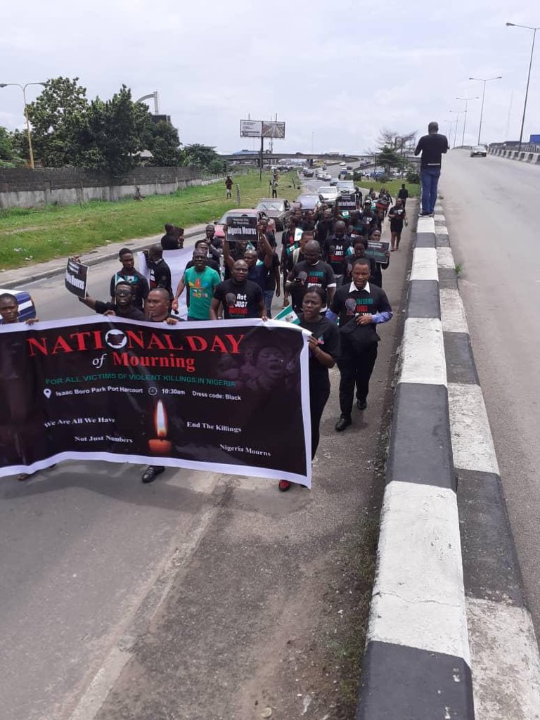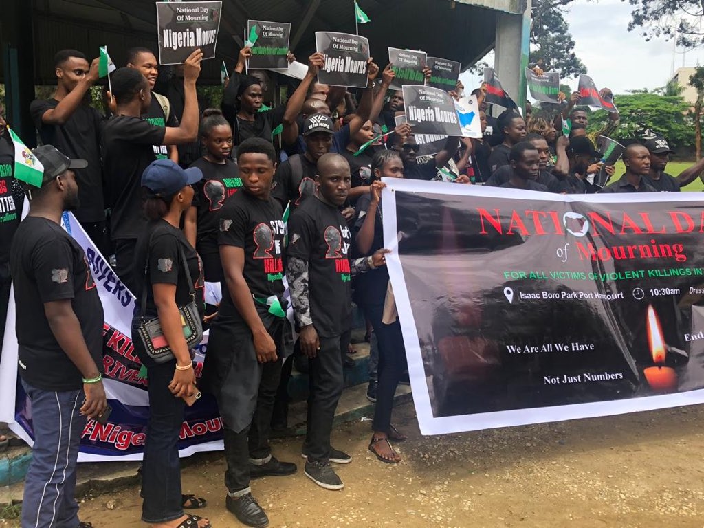 Nigerians all over the country on Tuesday staged peaceful protests to mark the 2019 national day of mourning, a day set aside to mourn victims of violent killings, terrorism, kidnapping and police brutalities and also for the citizens to demand that security agencies provide accountability on the death of Nigerians around the 6 geopolitical zones and FCT.