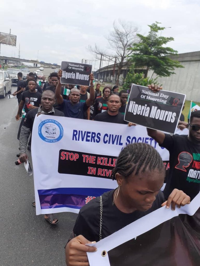 Mourners converged at the Isaac Boro Park and marched through the streets of Port Harcourt adorned in Black. They also displayed placards with different inscriptions.