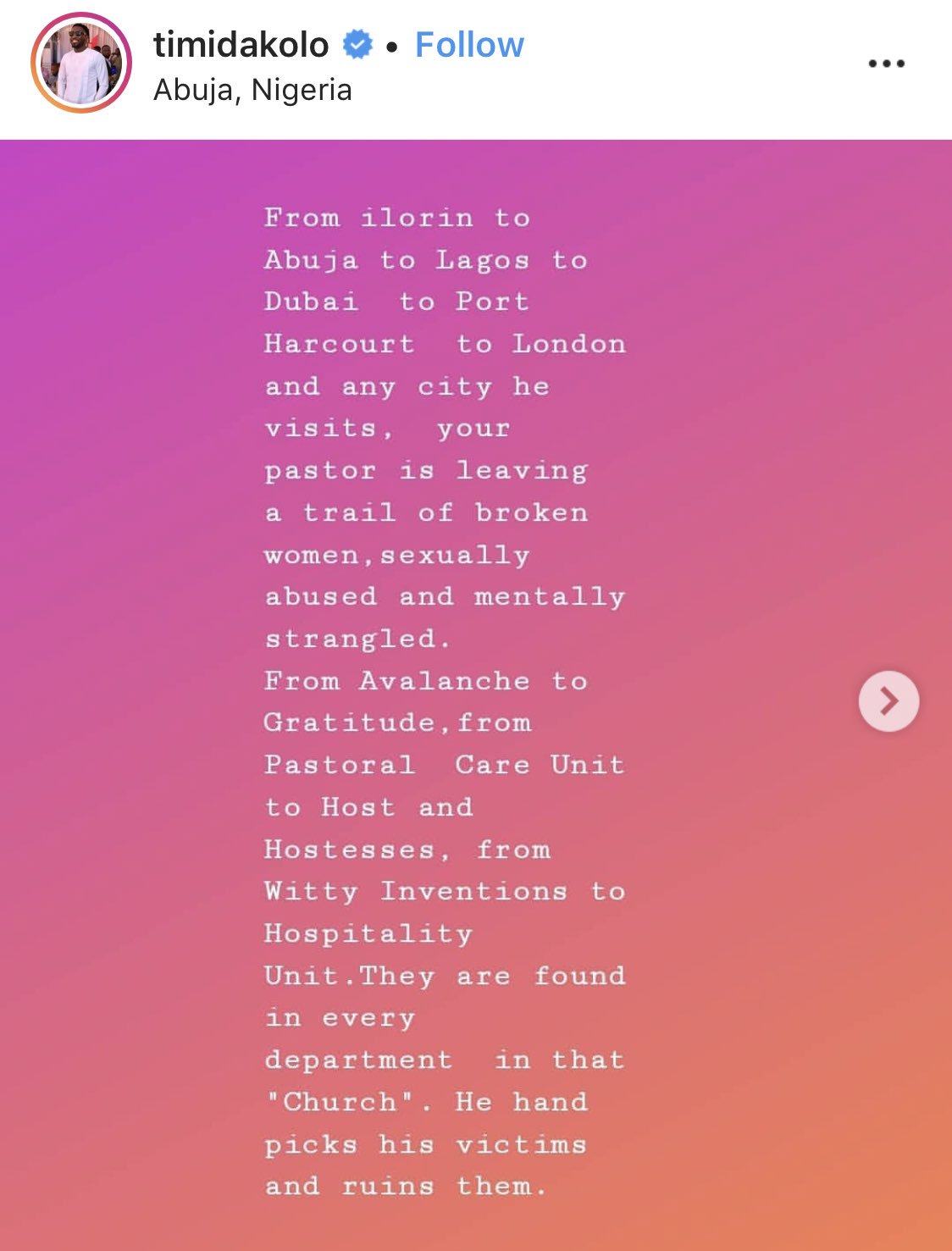 “From florin to Abuja to Lagos to Dubai to Port Harcourt to London and any city he visits, your pastor is leaving a trail of broken women, sexually abused and mentally strangled. From Avalanche to Gratitude, from Pastoral Care Unit to Host and Hostesses, from witty Inventions to Hospitality Unit. They are found in every department in that “Church”. He hand picks his victims and ruins them.