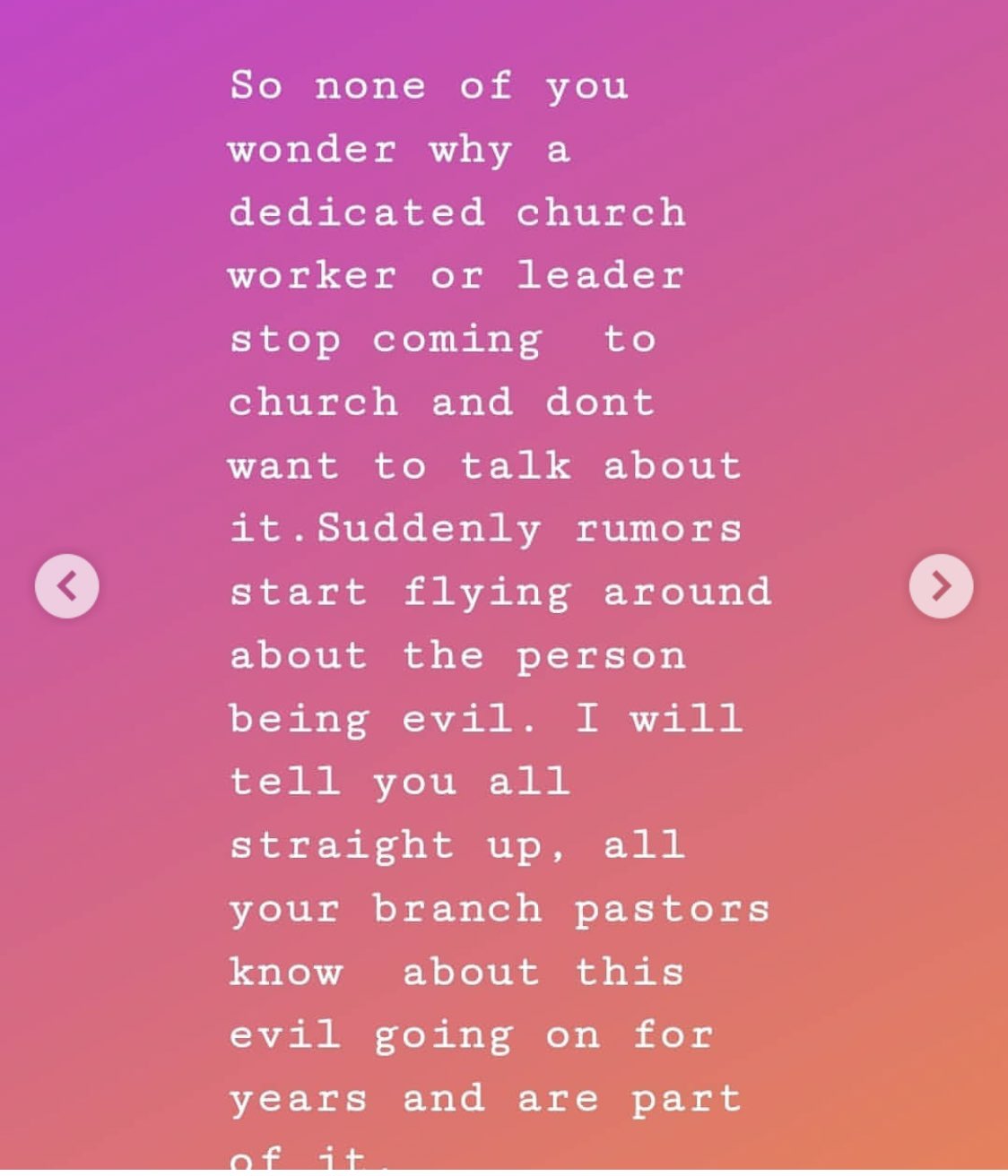 “So none of you wonder why a dedicated church worker or leader stop coming to church and don’t want to talk about it. Suddenly rumors start flying around the person being evil, I will tell you all straight up, all your branch pastors know about this evil going on for years and are part of it.