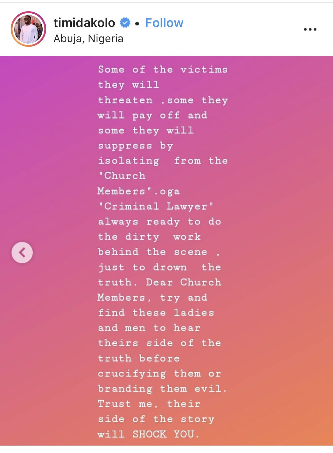 Dakolo in a series of post called on members of the church to “try and find” these ladies and men who have at one time come out to say their truth but got shut up by the pastor and his “criminal lawyers”.