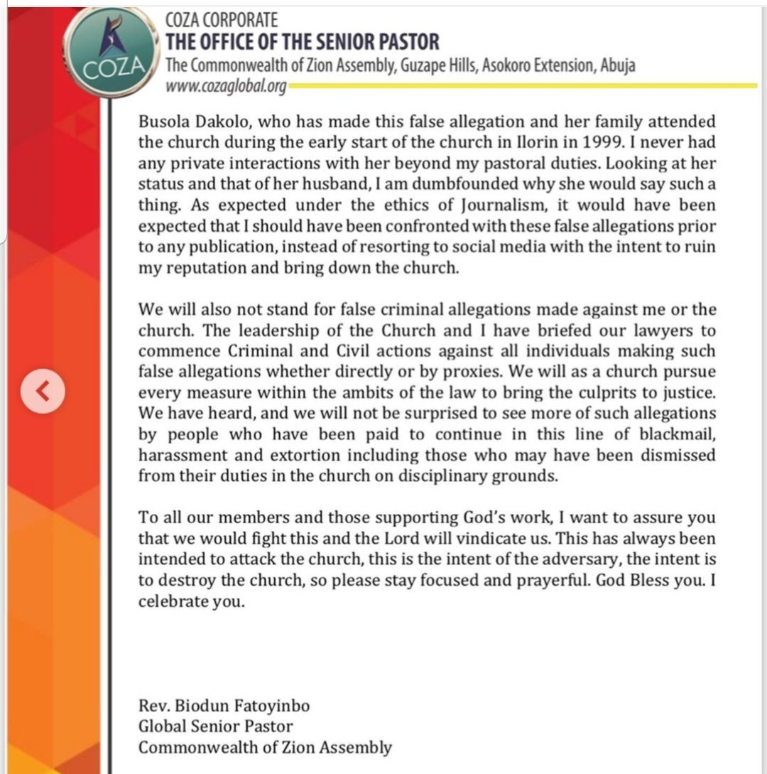 Busola Dakolo, who has made this false allegation and her family attended the church during the early start of the church in llorin in 1999. I never had any private interactions with her beyond my pastoral duties.