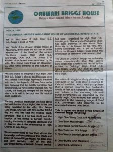 Recall that the Chiefs from the Oruwari Briggs House in Abonnema had on May 23, 2019, in a publication, raised concerns over the whereabouts of the patriarch.