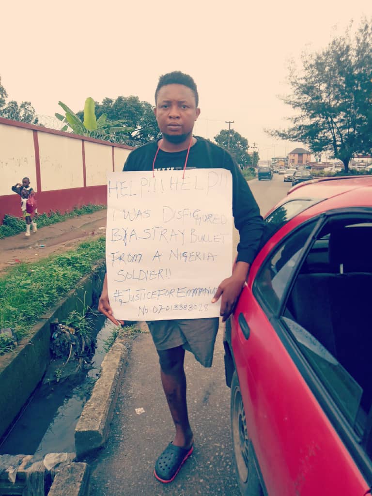 According to the victim, Mr Emmanuel Chika Madubuezi, he was on his way to school for his exams on the 14th day of September 2017 when he was hit by a stray bullet which led to his left limb being amputated.