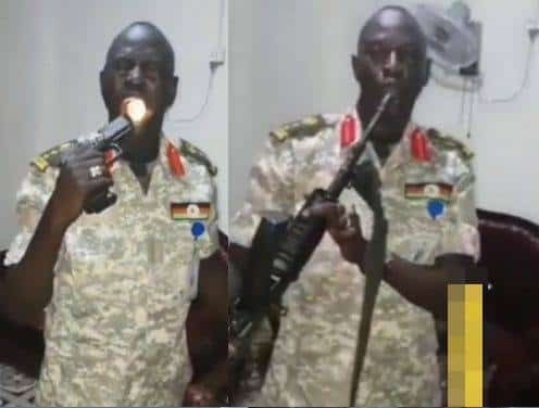 A yet-to-be-identified soldier from an African country has taken to social media to show off the potency of his acquired bullet charm as he fires different types of guns into his mouth without any injury.