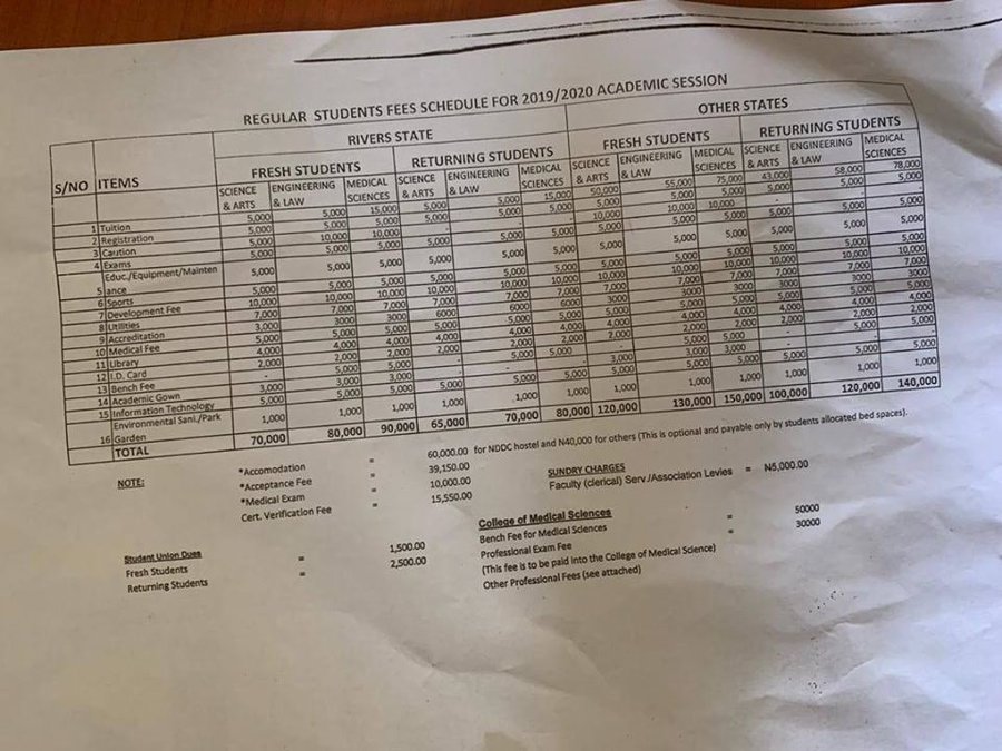 In the new school fees schedule obtained by theportcitynews, Rivers State indigenes would pay from N65 000 to N90 000 as against the initial 43 000 while non-indigenes would pay from N120 000 to 150 000 as against the initial 70 000.