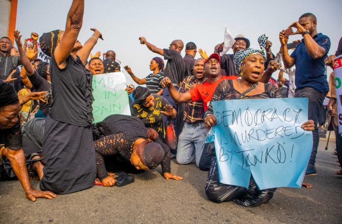 The protesters, mainly members of the Peoples Democratic Party carried placards denouncing the judgement, with some asking the eminent jurists to reverse themselves.