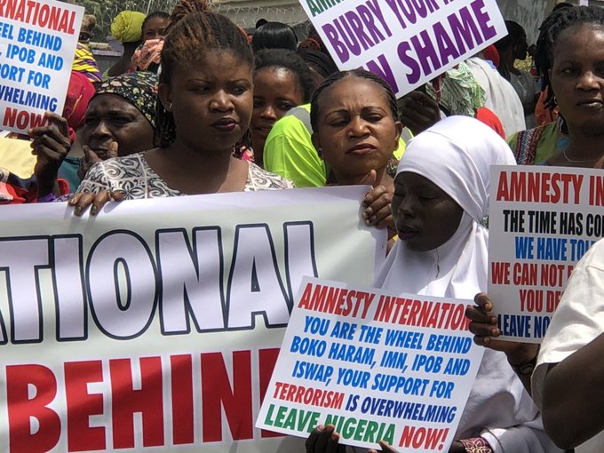 The paid protesters wielding different placards accused AI of being behind Boko Haram and other terror groups.