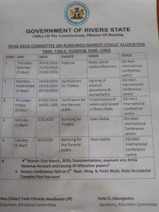 Rivers State Govt Exco Committee on the Allocation of Rumuwoji Market has invited the general public to the verification exercise and balloting for the allocation of Rumuwoji Market stalls.
