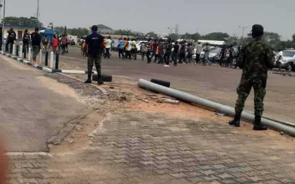 At the airport entrance gate, there are soldiers and two police vehicles while others comprising officials of the Department of State Security, Nigeria Security and Civil Defence Corps were stationed at various points of the Airport.