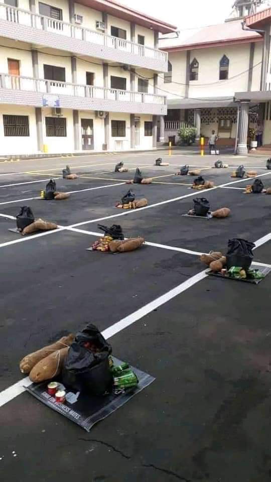The relief materials which include rice, yam, tin tomatoes, garri and other food stuff were seen set 5 meters apart at the church premises.