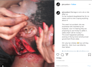According to Glory Odum, the lady was slaughtered for no reason and further revealed that “they are now proposing to use money to settle the incident”.