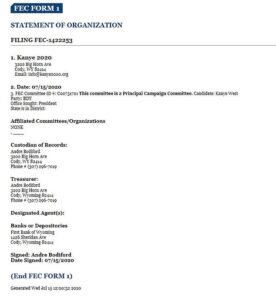 The rapper filled out the first form required by the FEC to run for president – Form 1: Statement of Organization – declaring that the Kanye 2020 committee will serve as the ‘Principal Campaign Committee’ with West as its candidate.
