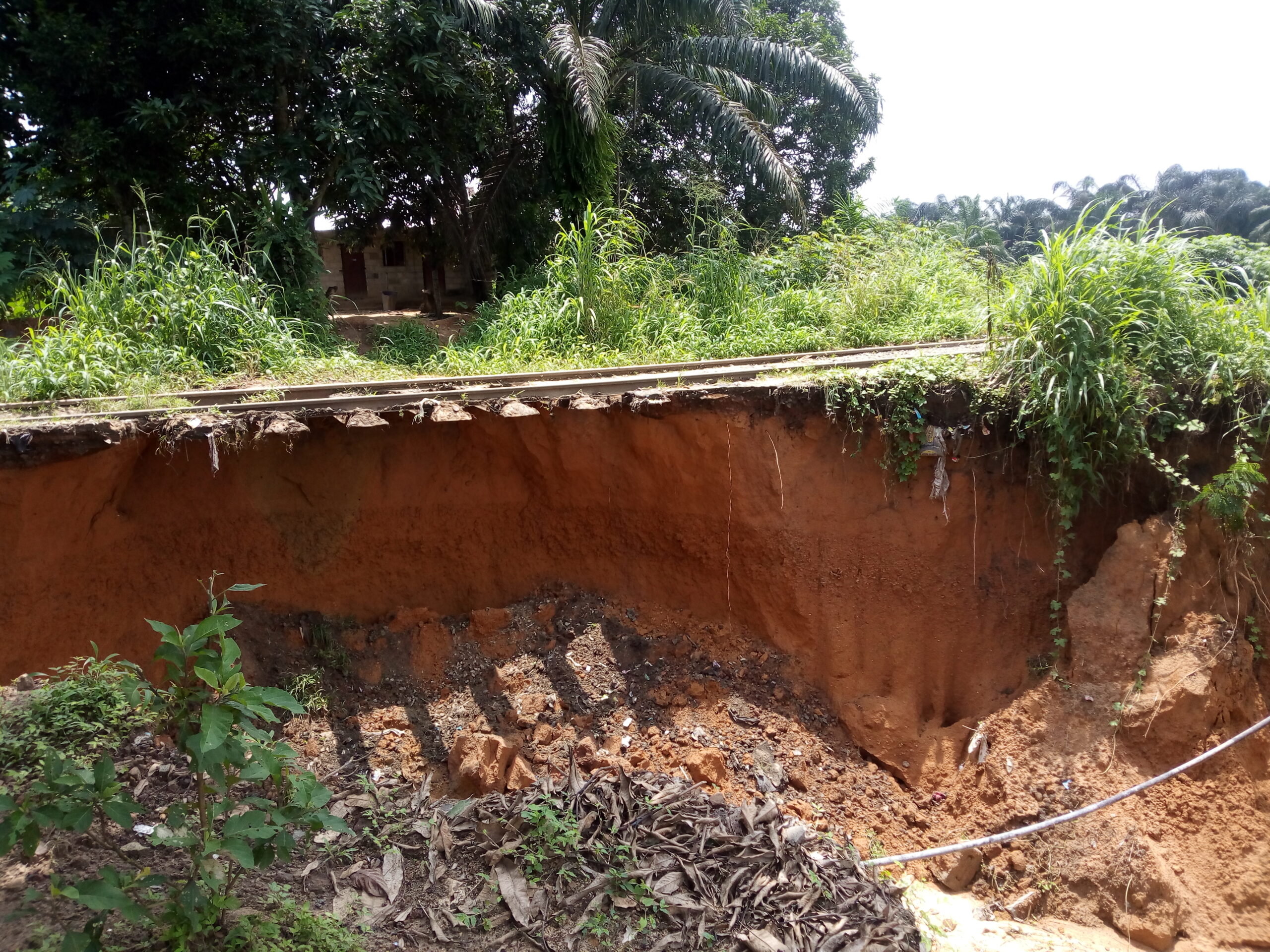 Danger looms in Kom-Kom community in Oyigbo local government area after gully erosion hit the area thereby affecting the Port Harcourt- Maiduguri rail track.