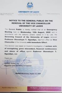 According to a statement signed by the Registrar and Secretary to the Varsity Council, Oladejo Azeez, titled, ‘Notice To The General Public On The Removal Of The Vice-Chancellor Of The University Of Lagos’, the council said “The general public is hereby notified that at an emergency meeting held on Wednesday, August 12 2020 and in accordance with the statutory powers vested in it by law, the Governing Council of the University of Lagos removed Prof. Oluwatoyin T. Ogundipe, FAS from office as Vice-Chancellor of the University with immediate effect.