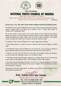 The national leadership of the National Youth Council of Nigeria, NYCN, has declared its support for the Nigerian Labour Congress and Trade Union Congress over their planned protest and strike in Port Harcourt.
