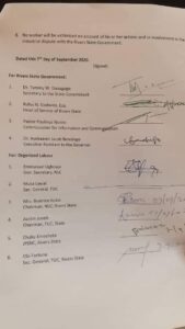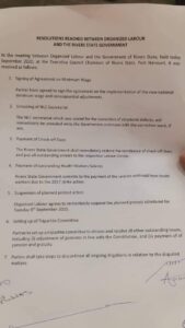 In a document sighted by the theportcitynews and signed by both representatives of the state government and Organised Labour, the two warring groups after an extensive meeting at the Council Chambers of the state government house agreed on seven key points.