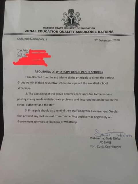 According to a letter dated Monday, December 7, 2020 and signed by Muhammad Sada Dikko on behalf of the Zonal Coordinator, Katsina State Ministry of Education, all school principals are ordered to close all school WhatsApp groups.
