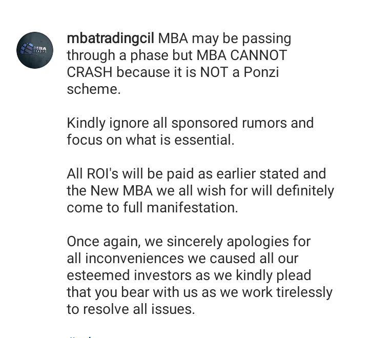 MBA Trading Company, on Wednesday reacted to reports that the scheme has crashed, saying it cannot crash because it is not a ponzi scheme.