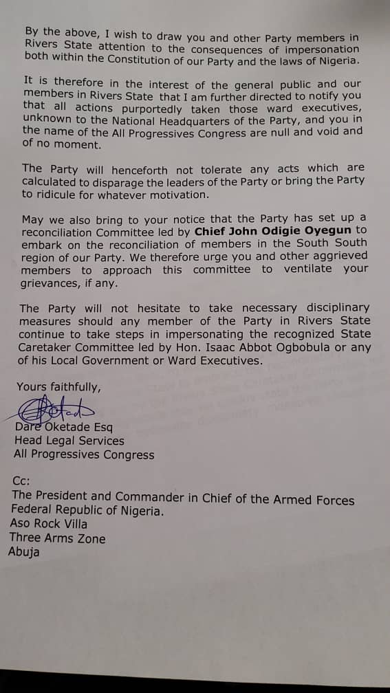 “It is therefore in the interest of the general public and Our members in Rivers State that I am further directed to notify you that all actions purportedly taken by those ward executives, unknown to the National Headquarters of the Party, and you in the name of the All Progressives Congress are null and void and of no merit.